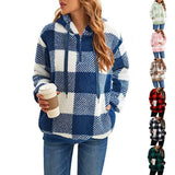 Fashion Plaid Hooded Sweatshirt With Pockets Casual Zipper Plush Tops For Womens Clothing