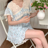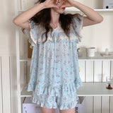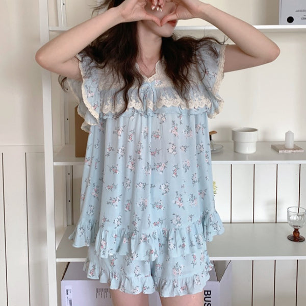 Ruffled Lace Floral Pure Cotton And Linen Pajamas