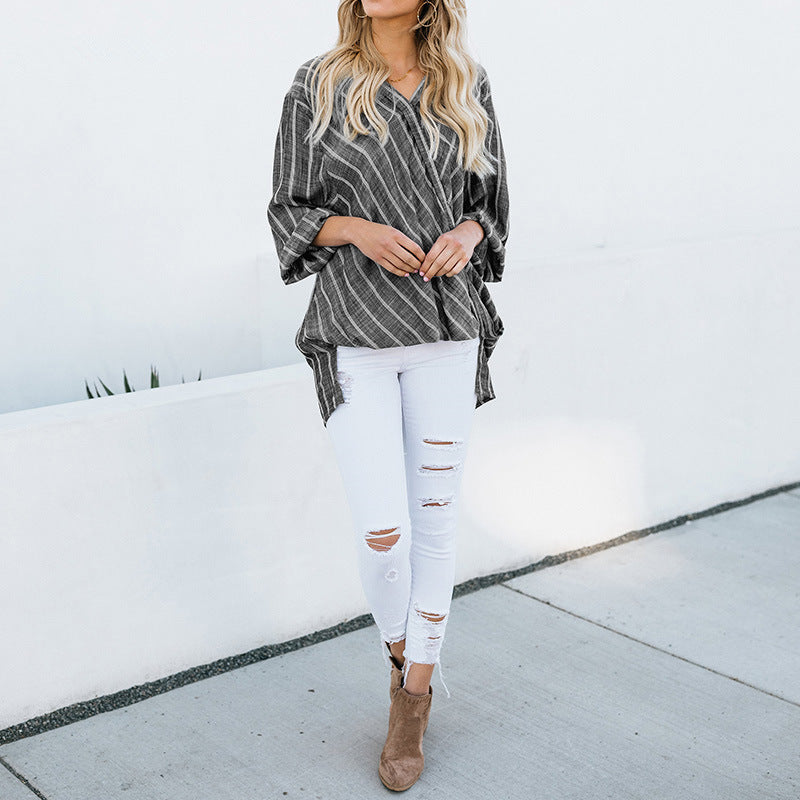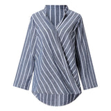 Striped Cotton And Linen Irregular Long Sleeve Plus Size Blouse
