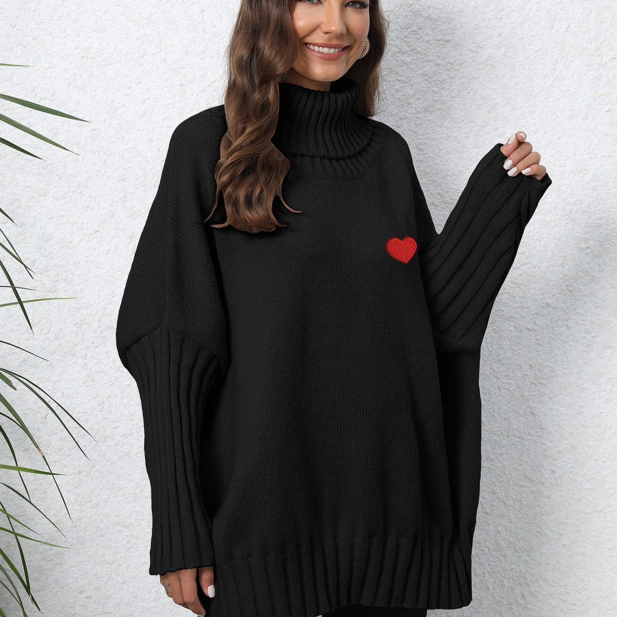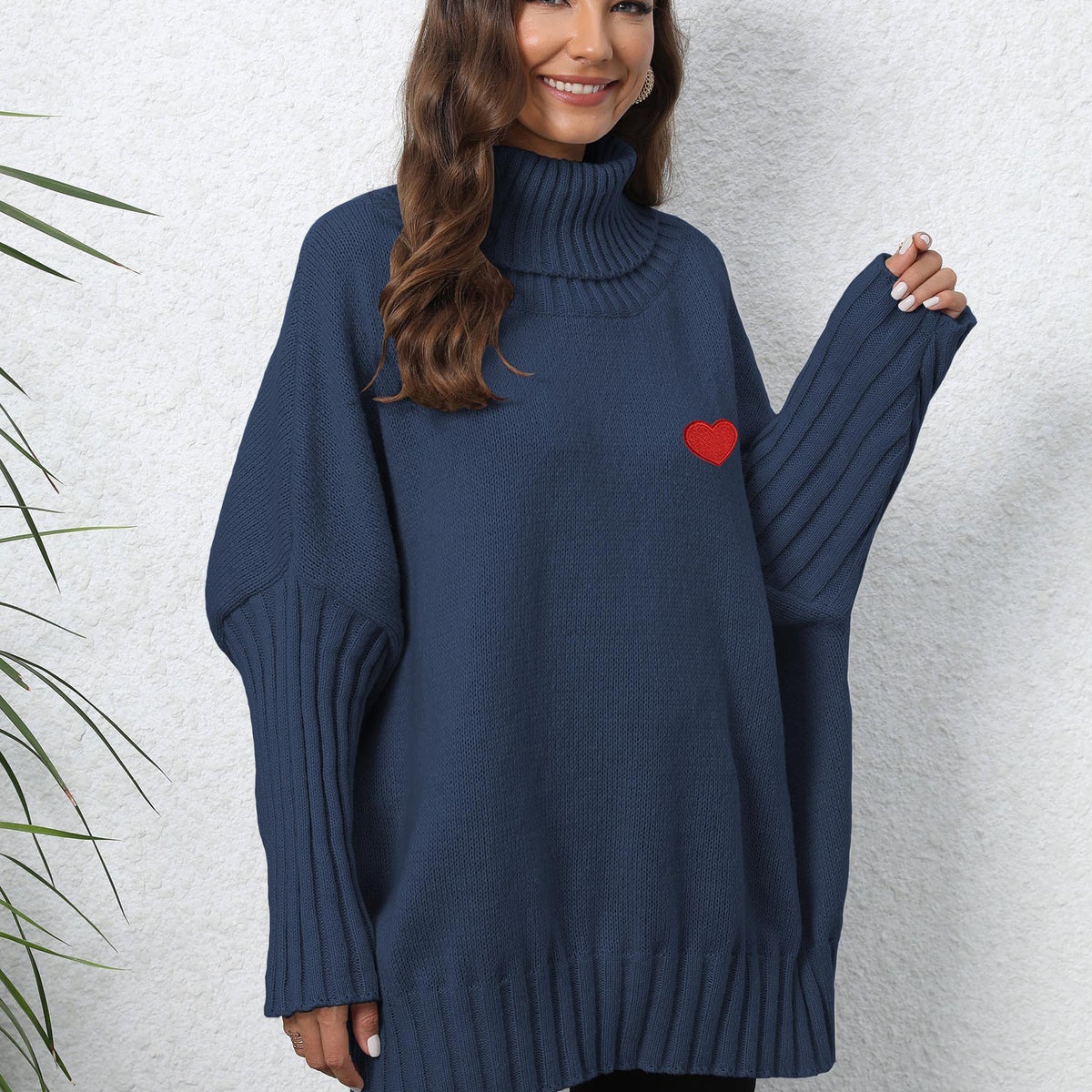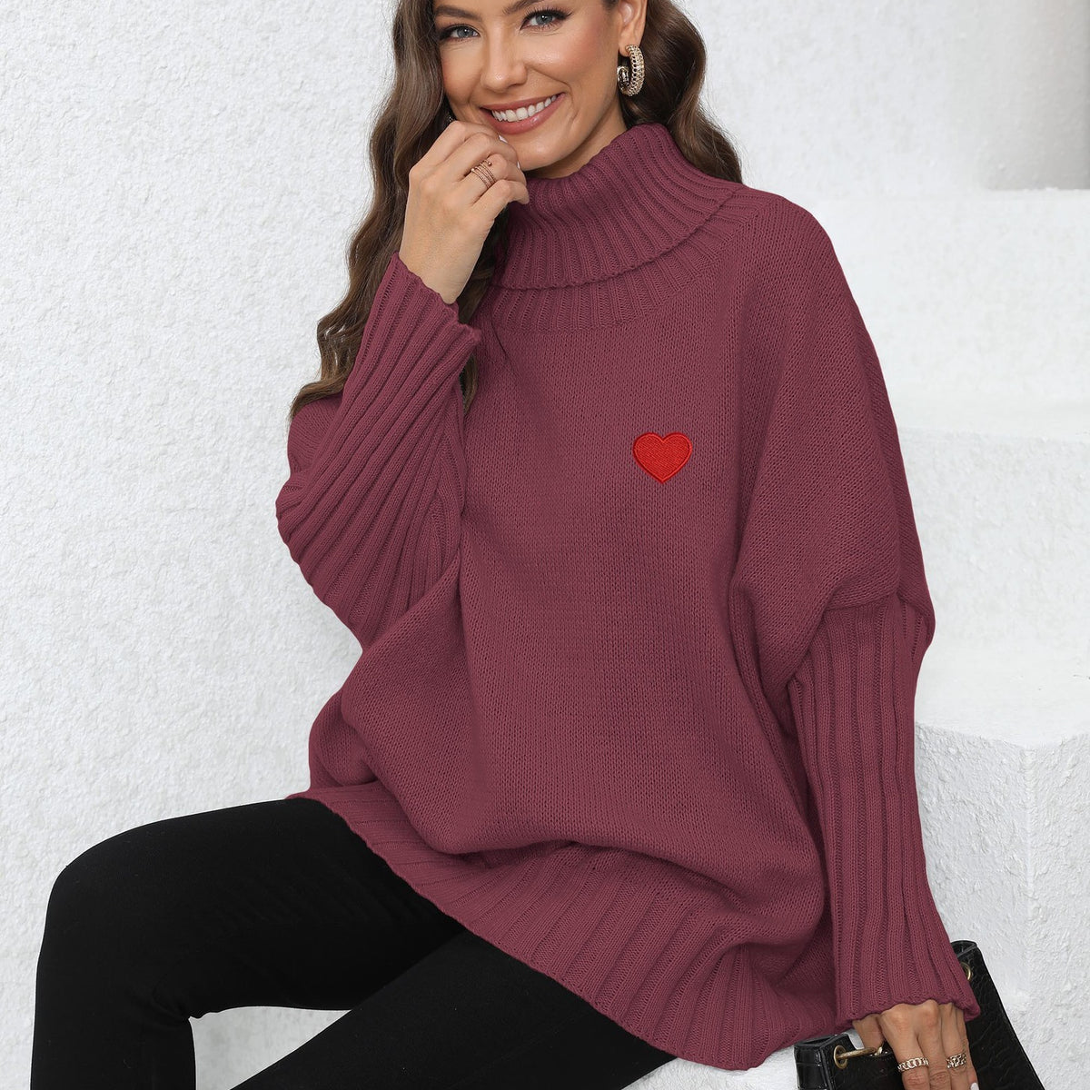 Women's Clothing Knitted Solid Color Turtleneck Lapel Loose Woven Love Stickers Sweater